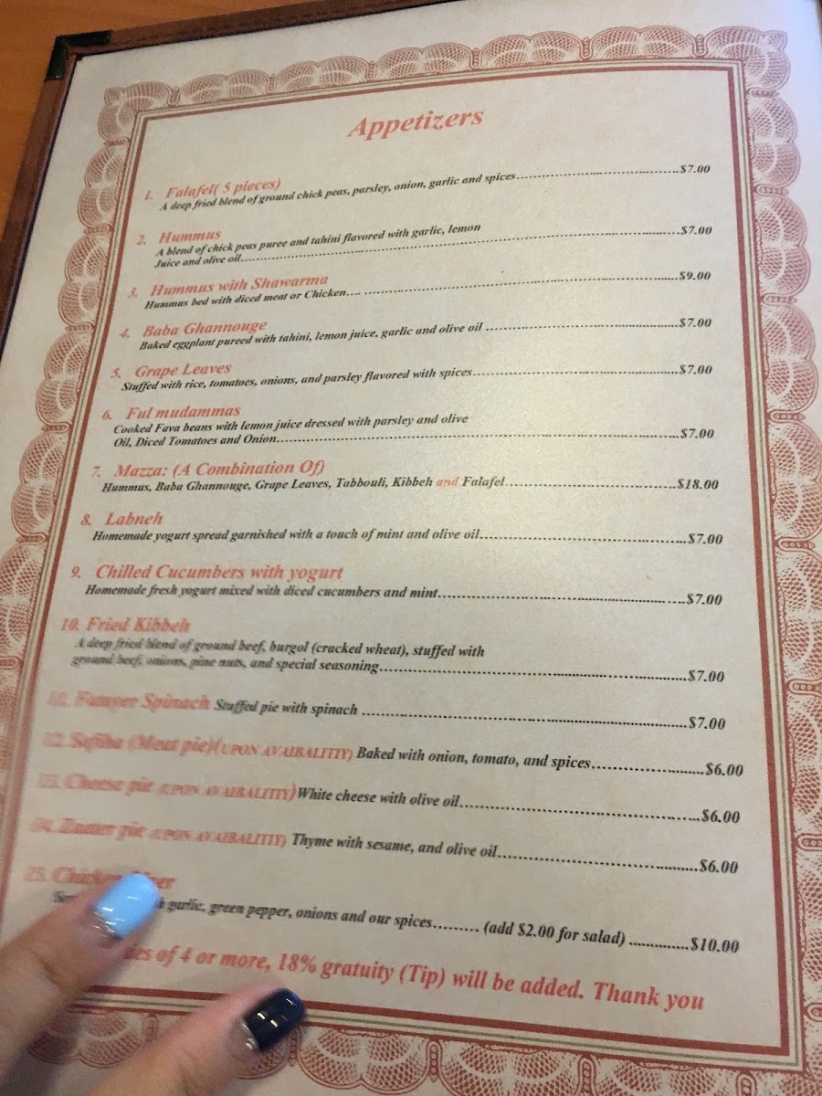 Hummus, Baba Ghanoush, Falafel, Tabouli and Grape leaves.