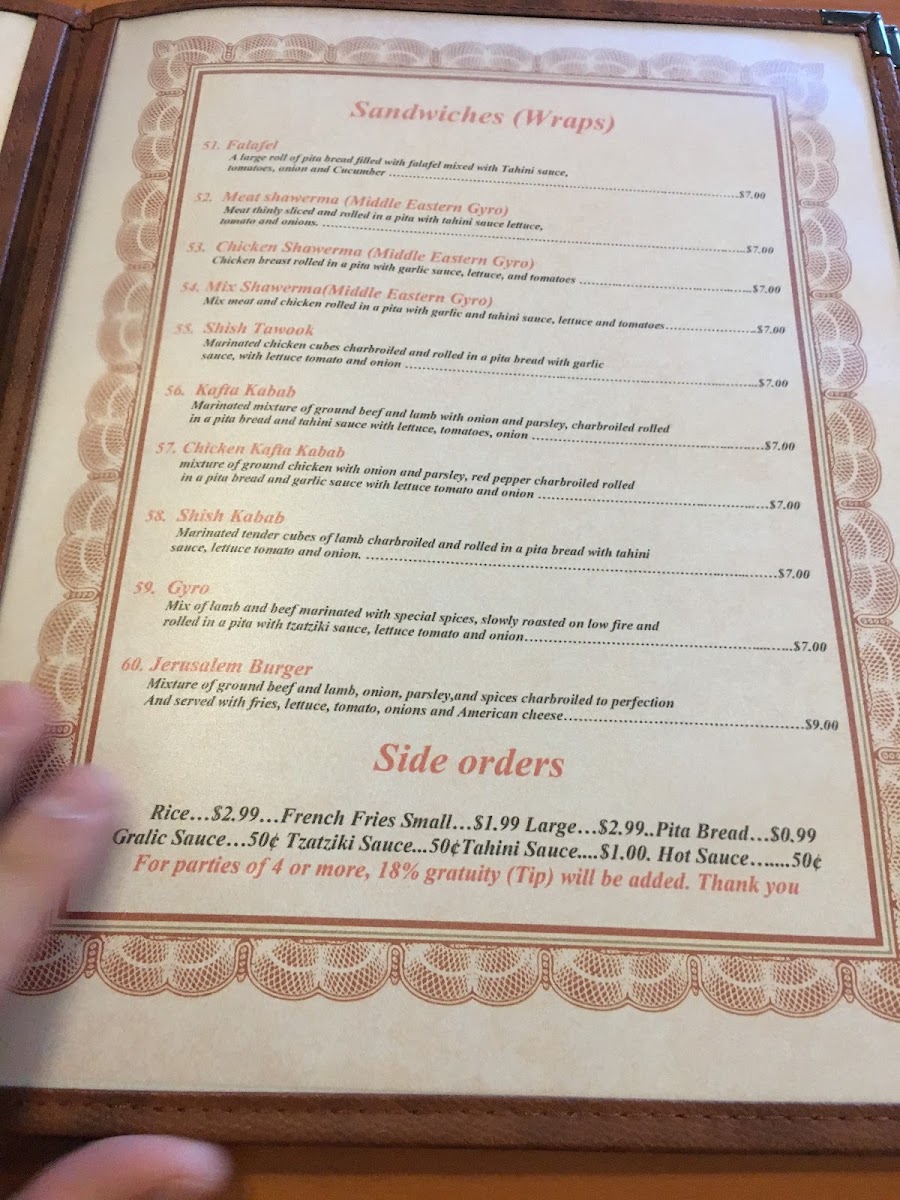 Middle Eastern gyro. Meat thinly sliced and rolled in a pita with tahini sauce lettuce, tomato and onions.
